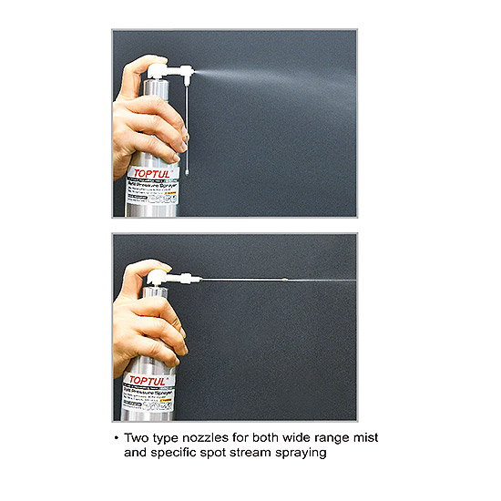 • Proporciona salida de fluido o aire incluso cuando se sostiene boca abajo, rocíe desde cualquier ángulo sin limitación de espacio